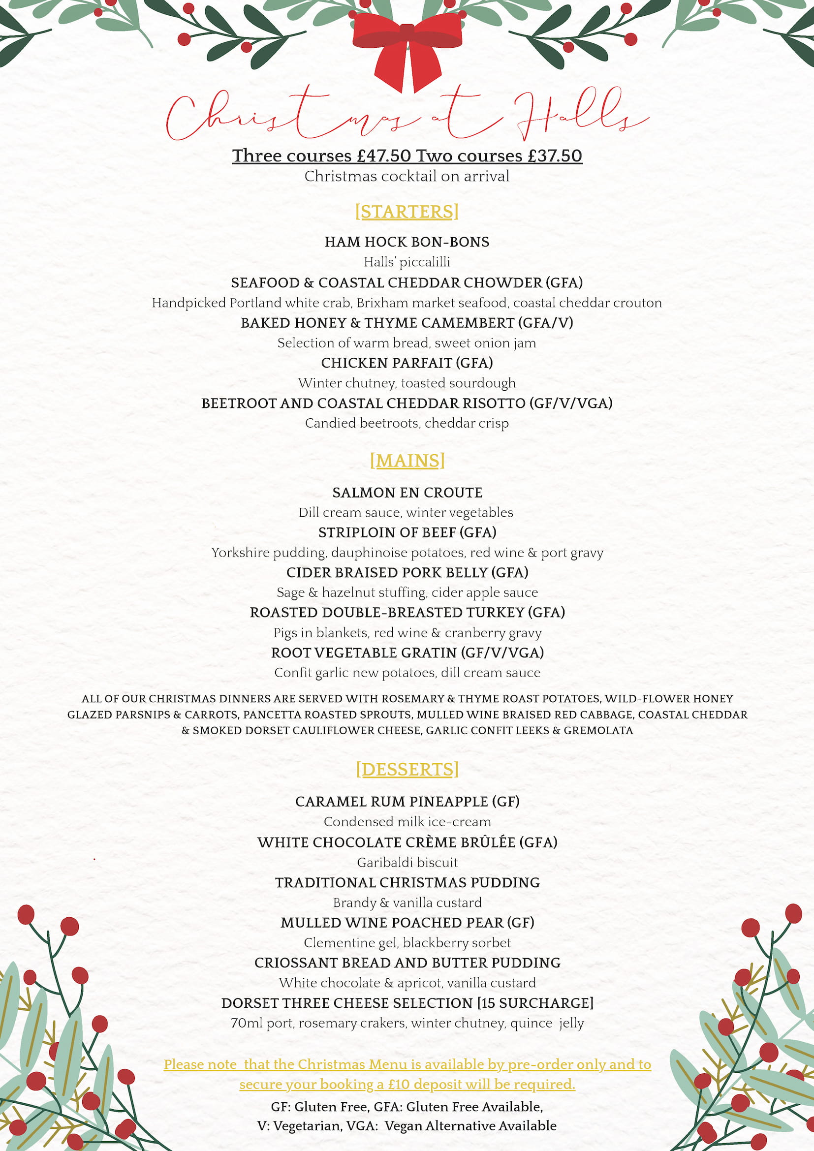 Join us at Halls this Christmas period! Running from 25th November up to Christmas Eve. Includes a Christmas cocktail on arrival.